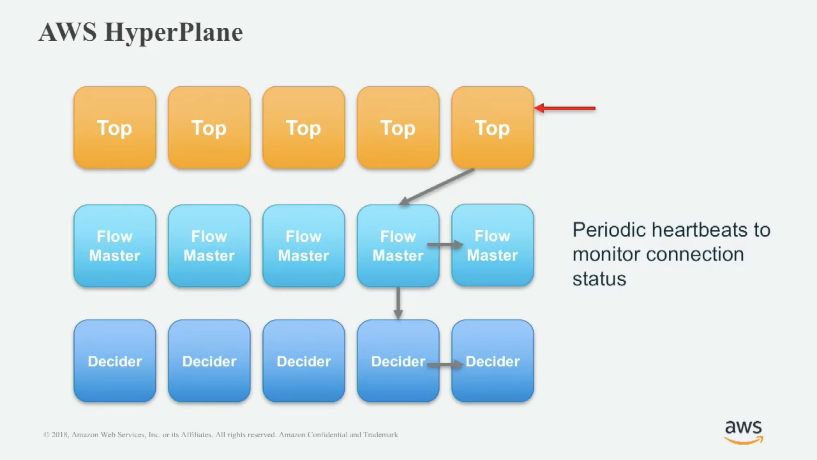 First, let’s zoom in and look at a more detailed architecture of Hyperplane. The packet processors are called Tops internally, and the flow trackers are composed of two components, Flow Masters and Deciders.